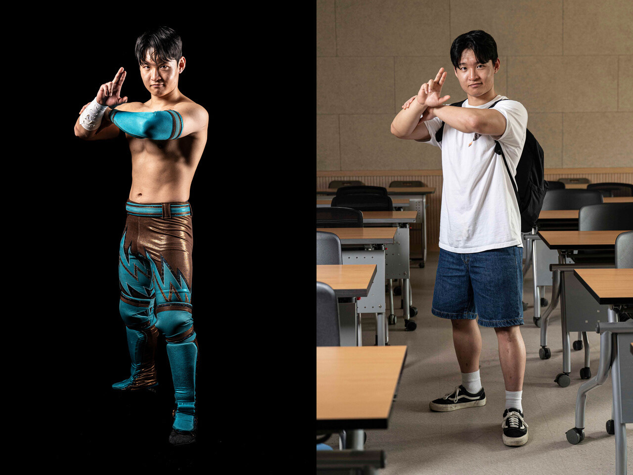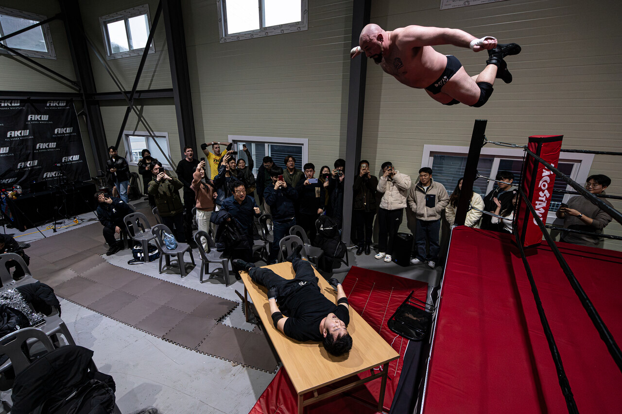 2024년 2월4일 경기 광주시 AKW 퍼포먼스 센터에서 열린 전한국프로레슬링 대회에서 브라이언 레오 선수가 나무 책상 위에 누워 있는 구스타브 선수에게 고난도 공중 기술 ‘프로그 스플래시’를 시전하기 위해 몸을 날리고 있다. ⓒ박민석